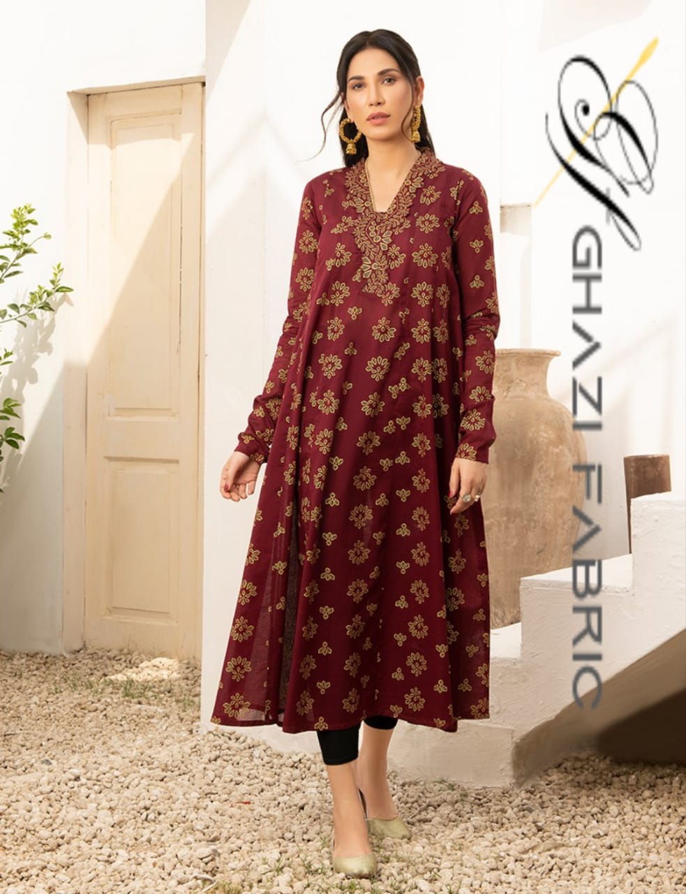 Embrace elegance and style with Ghazi fabric Stitched Linen Printed Long Frock Gull-E-Maryam Pret Collection Ready to Wear Maroon(GF4309)