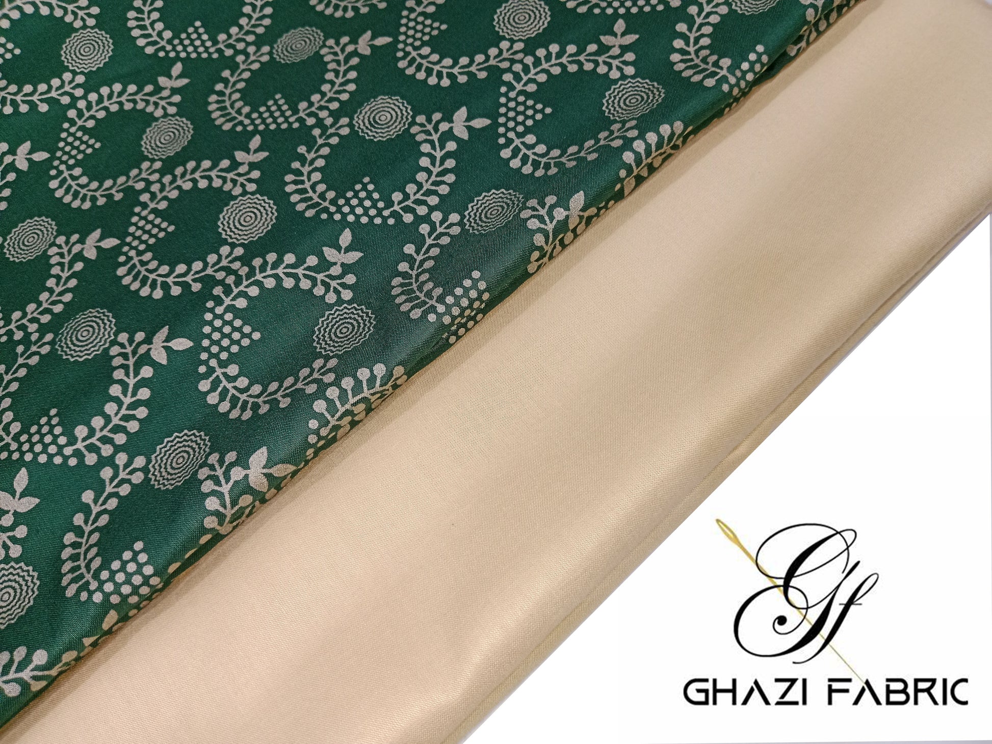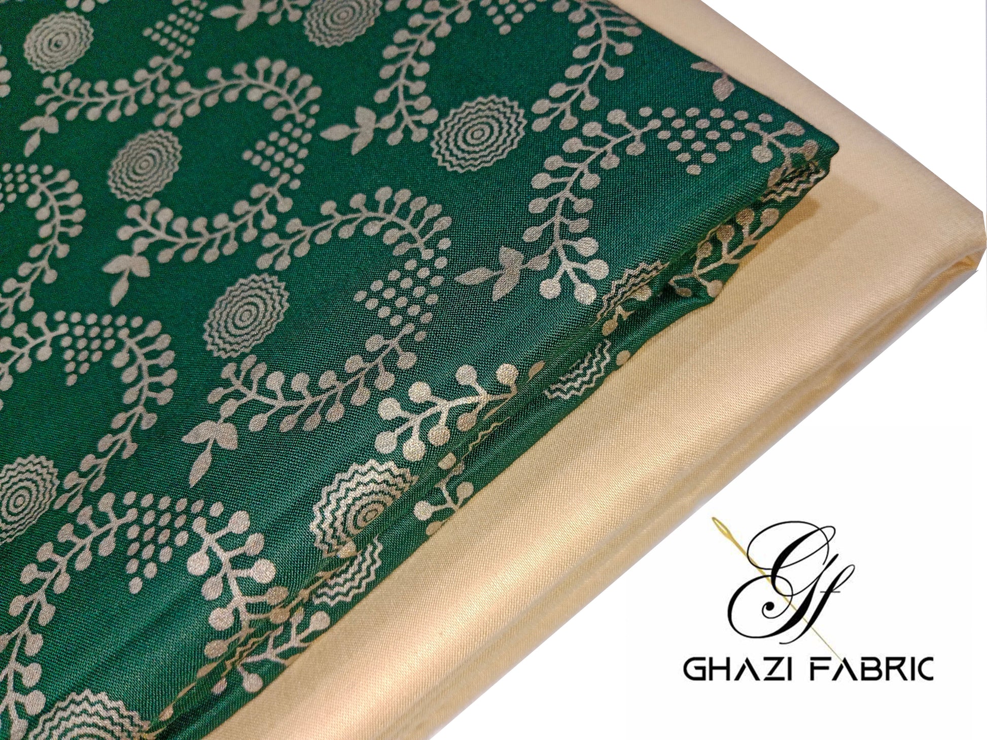 Ghazi fabric Un-stitched Premium Quality Linen Dress Collection Famza Series Unstitch 2 Piece Suit For Women Bottle Green with beige trouser (FM9134-H9)