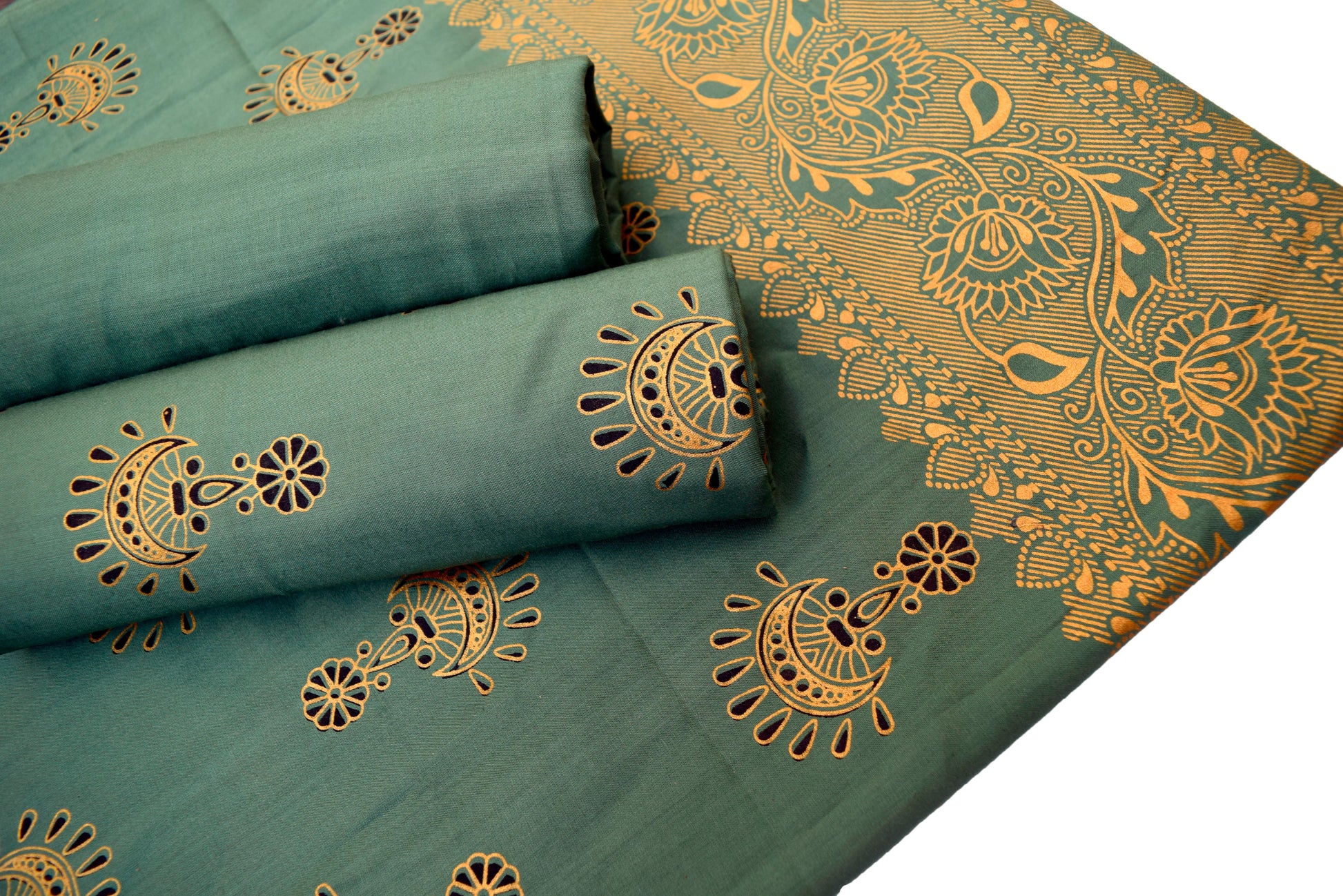 Ghazi fabric Unstitched Linen 3 piece Gold printed suit for women cement green (UK series-345/8)